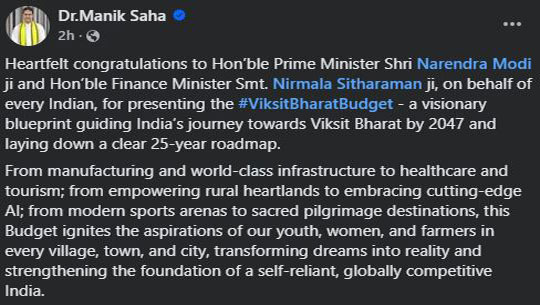 Chief Minister Dr Manik Saha on Sunday praised the Union Budget presen [..]